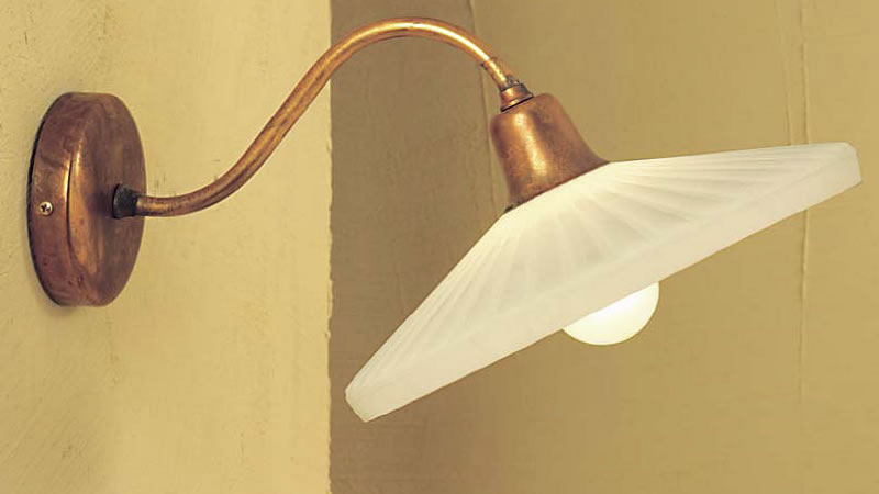 Applique parabola D.25 con ceramica travertino/cotto antico e vetro satinato