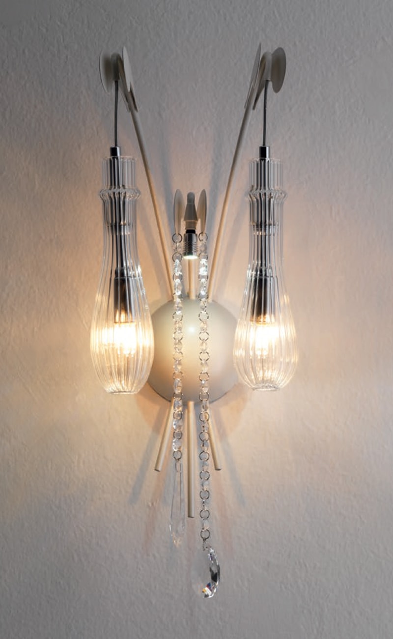 APPLIQUES 2 LUCI IN METALLO CON SFERE IN CRISTALLO SFACCETTATE, DIFFUSORI IN TESSUTO TULLE CON FILE DI PERLINE DI VETRO CUCITE SOPRA.