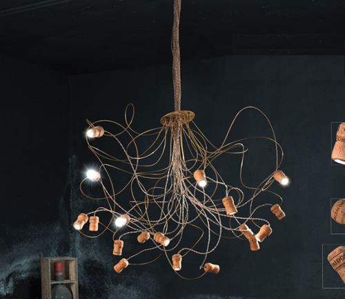 SOSPENSIONE 27 LUCI CON BRACCETTI IN FILO DI OTTONE MODELLABILE E DIFFUSORI CON TAPPI IN SUGHERO.