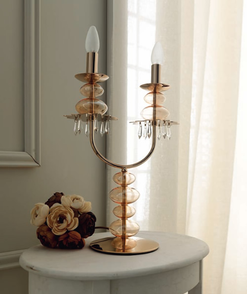Lampada da tavolo composta da fascia in metallo, disponibile nelle finiture Foglia argento e Foglia oro, e vetri fatti a mano.