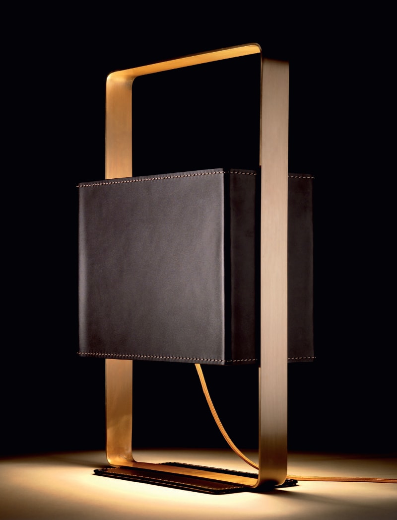 Lampada da tavolo creata dall'unione di materiali diversi come Cuoio e Ottone.